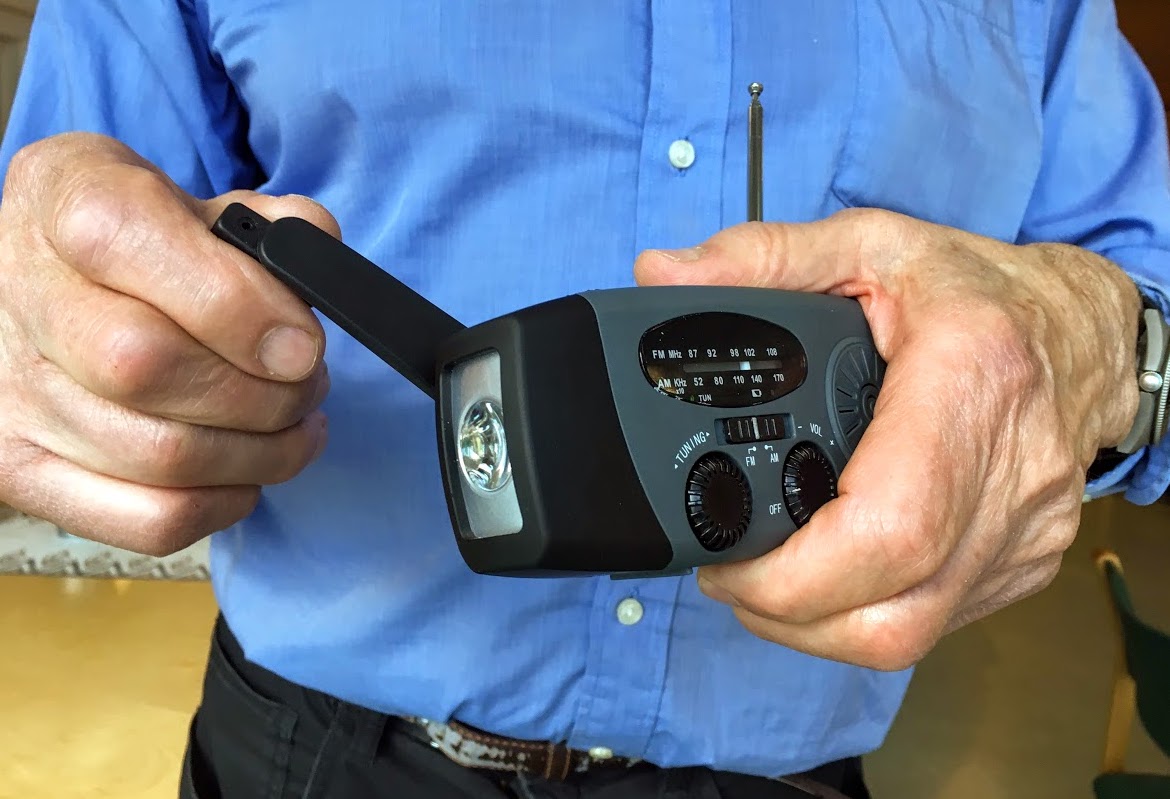 Bengt Jusélius visade 25.2.2019 en bildserie om ”Utsläppsfri energi med vind och sol” och demonstrerade en nödradio för kristid med laddare och ficklampa som drivs med solceller, dynamo, USB-kabel eller batteri.