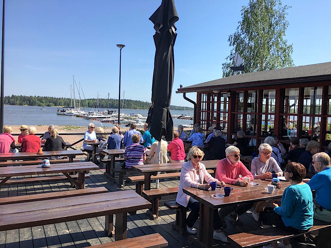 Eftermiddagskaffet med goda bakverk smakade utmärkt på terassen med utsikt över Skeppsbrons gästhamn längst inne i Lovisaviken.